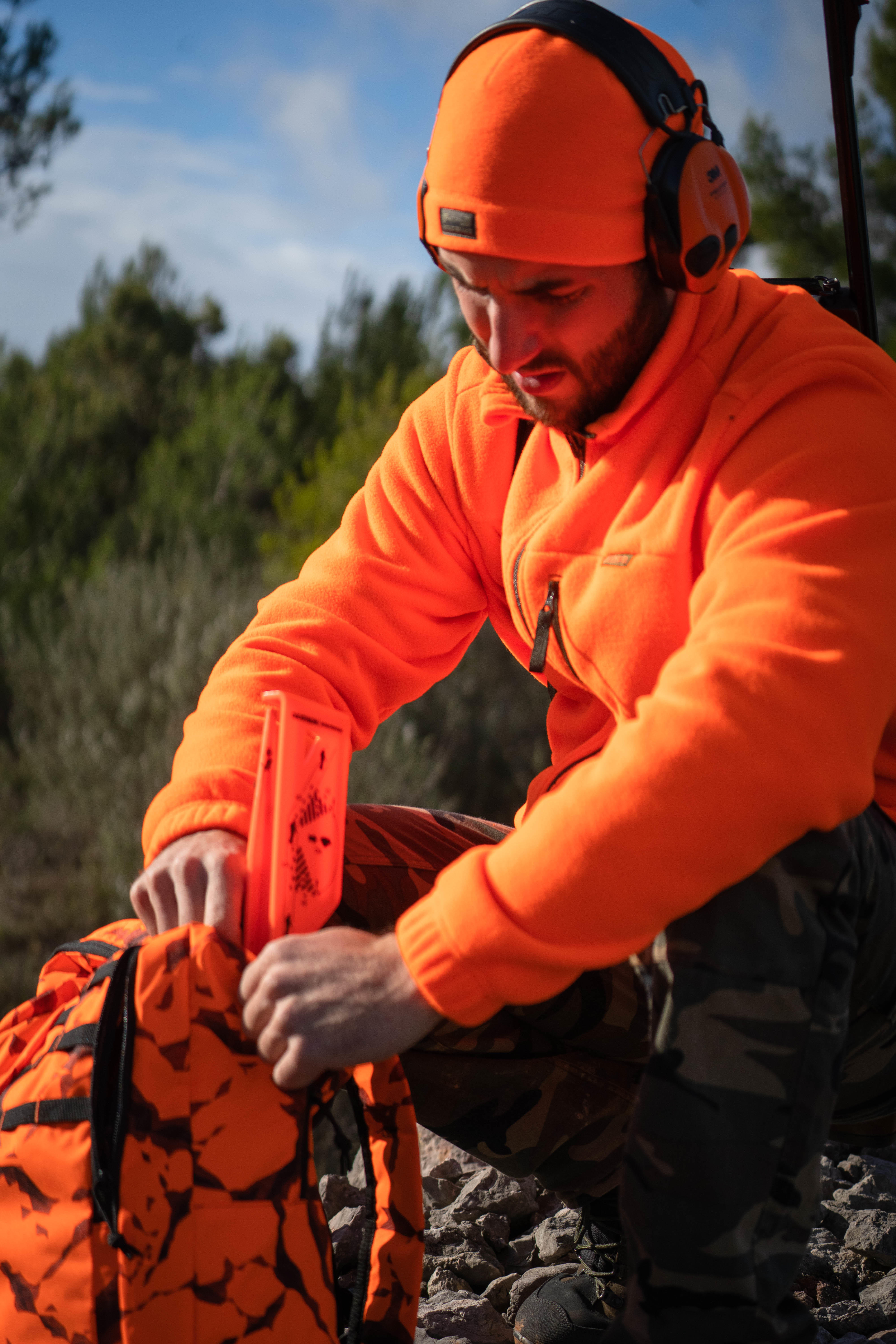 A hi vis beanie hat for hunting and other outdoor activities.