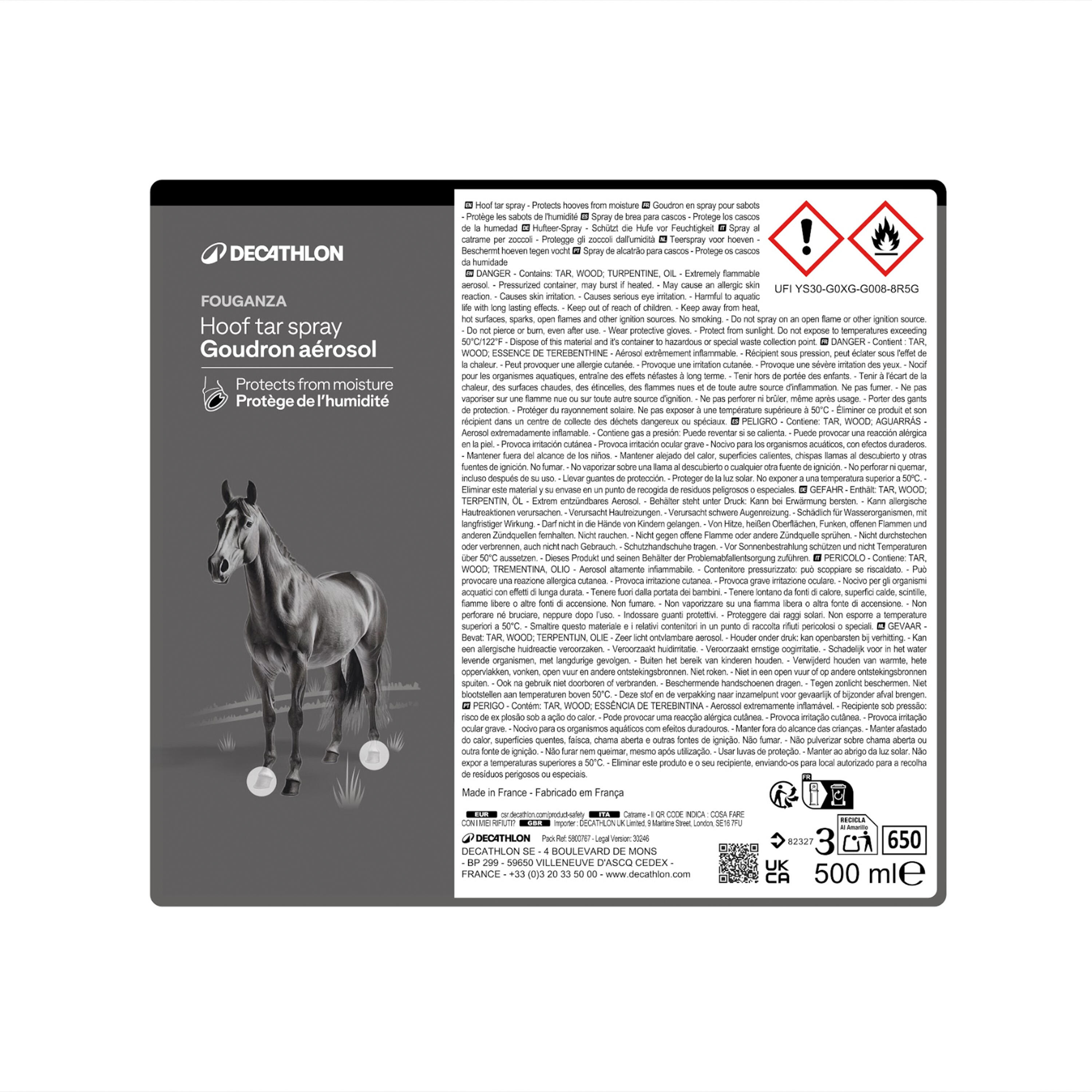Clean hooves with a hoof pick. Brush the sole and the frog. Wait until they are completely dry before applying tar. Shake before using. Spray nozzle side down in repeated short bursts 20 cm from the foot. Only apply under the hoof. Leave to dry.