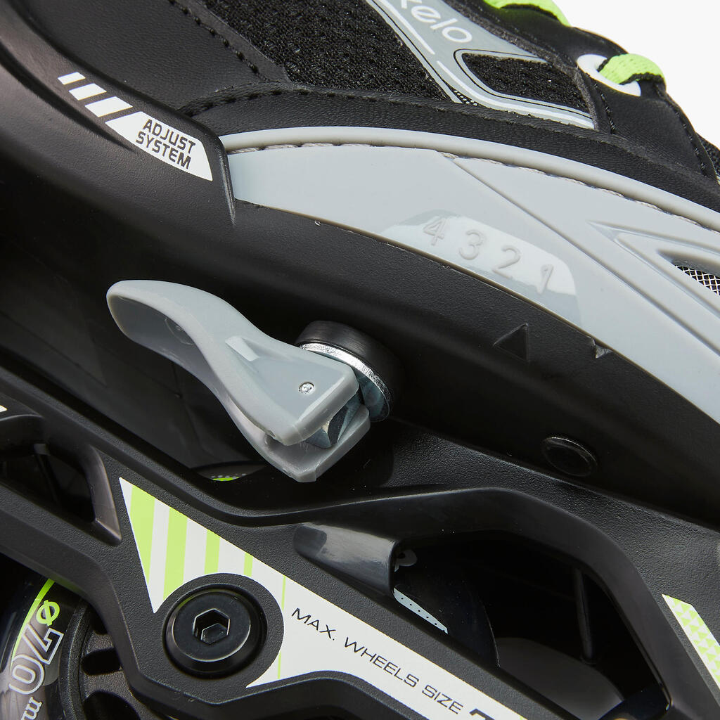 2. Pull on the front of the boot.3. Close the lever. Using this system, your child will be able to use these inline skates for more than one season. To keep your child comfy, choose skates that are suitable for their feet: avoid skates that are too heavy (not suited to their strength) or too big (their feet will slip inside the boot leading to poor posture & difficulty in controlling their movements).