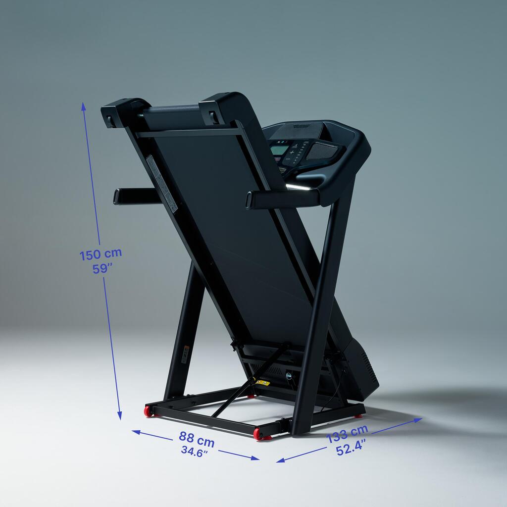 The T900 treadmill folds up to save space when not in use. When folded, you need just 133 x 88 cm of floor space.