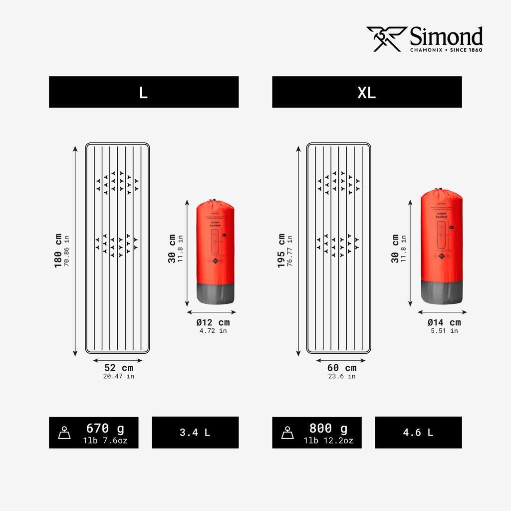 The difference between the 2 sizes on the length (180 cm for the L; 195 cm for the XL) and width (52 cm for size L; 60 cm for the XL).