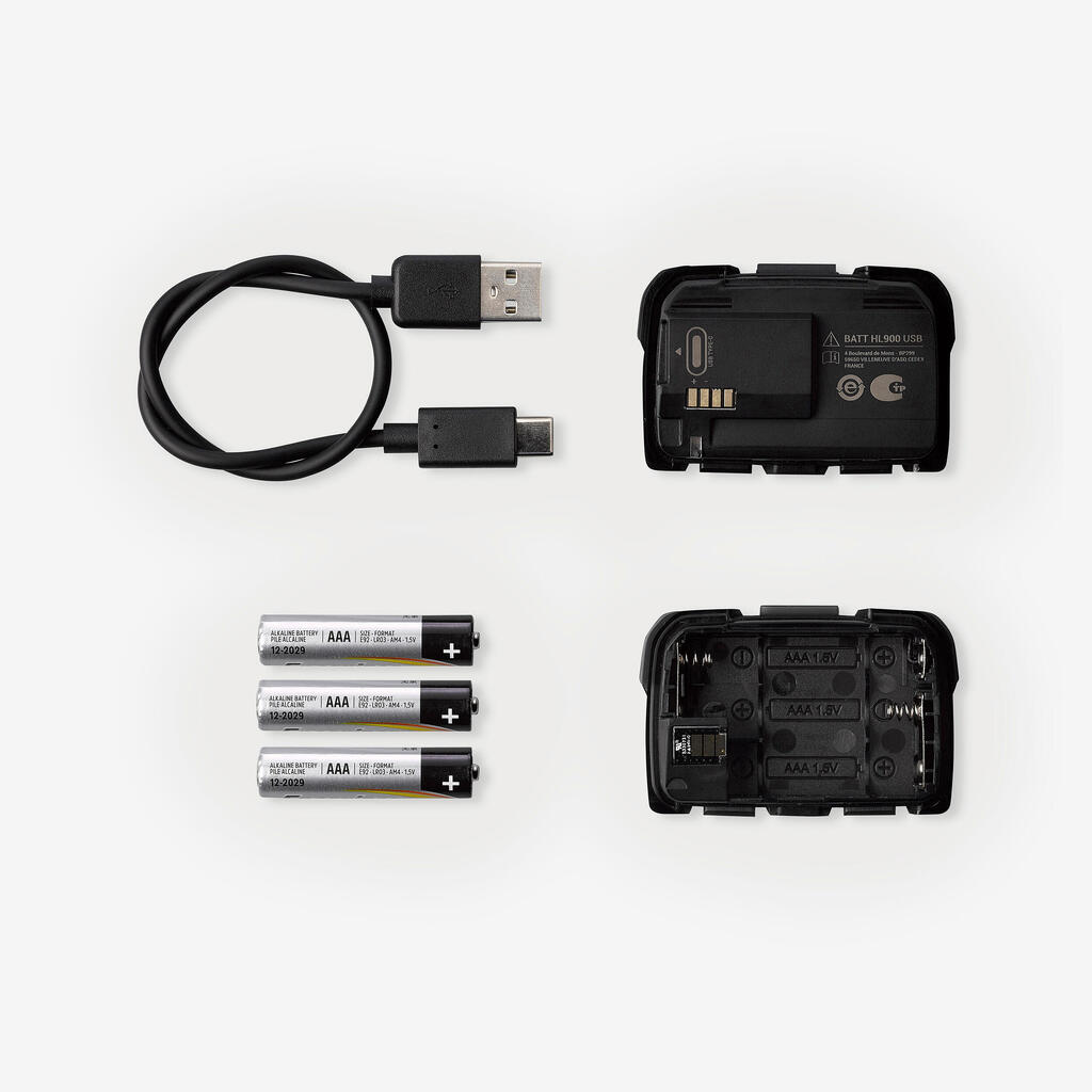 The HL900 USB headlamp comes with an adapter for 3 AAA batteries (not included). It enables you to use disposable batteries if you do not have a USB charger to hand or if you prefer disposable batteries to a rechargeable battery.