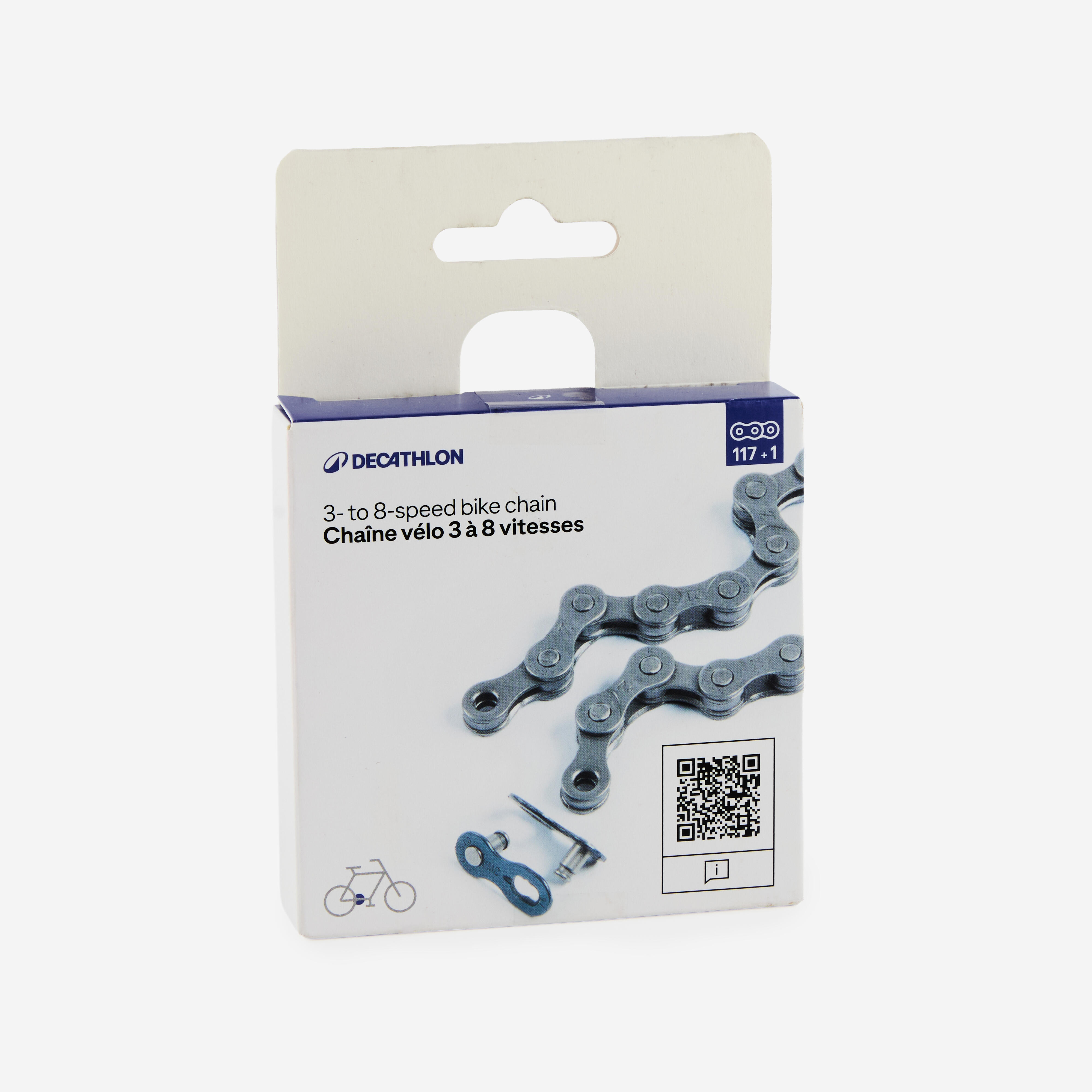 Our 3- to 8-speed chain, designed in collaboration with KMC, is compatible with Shimano and Btwin derailleurs... The 118-link chain comes with a quick-release fastener.
