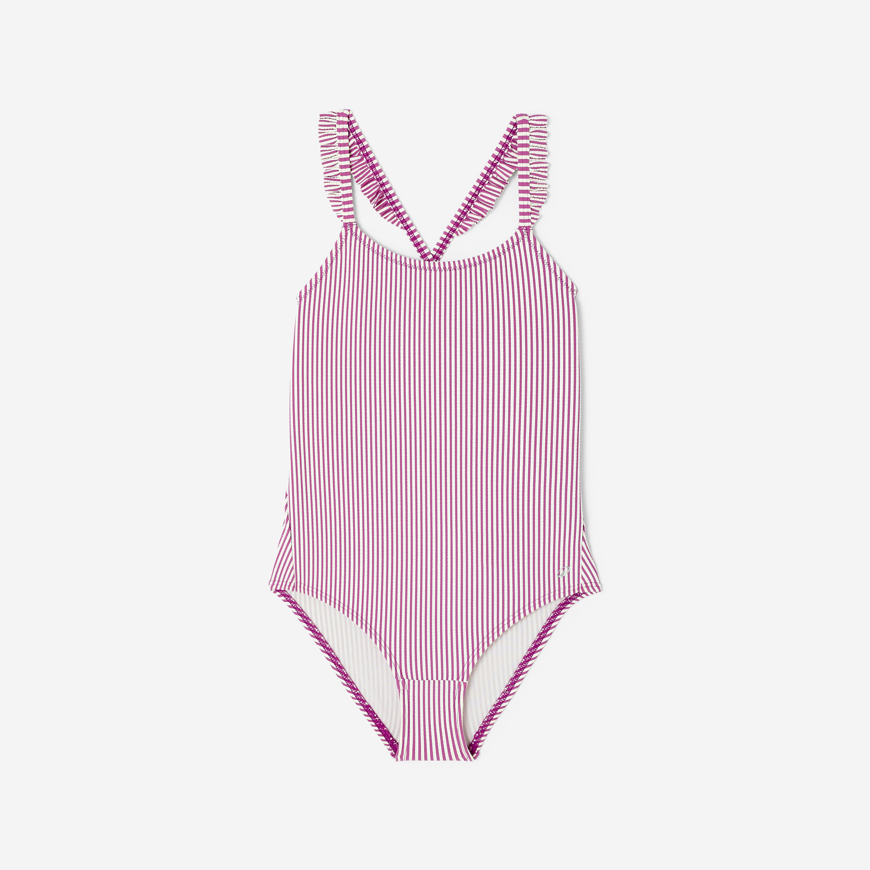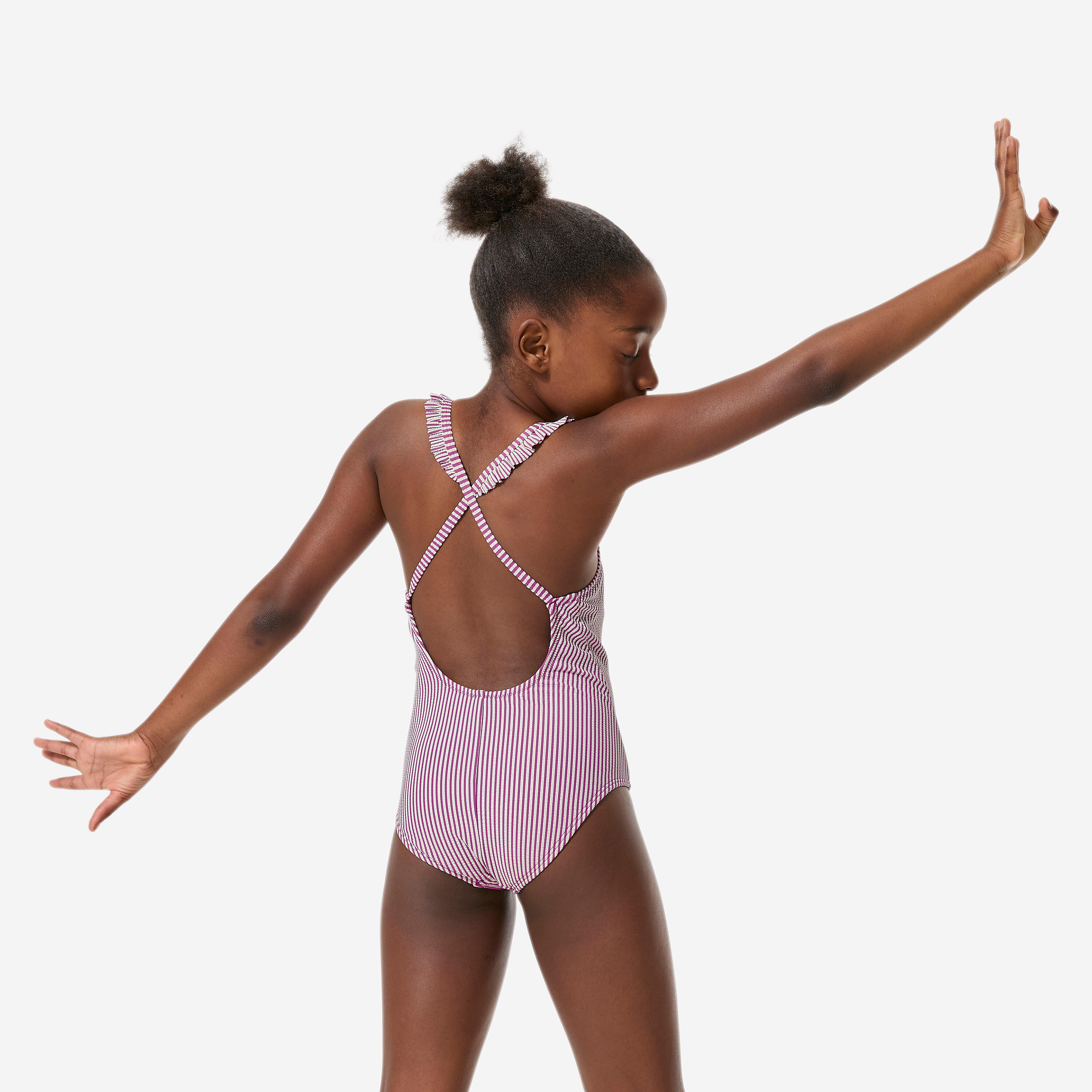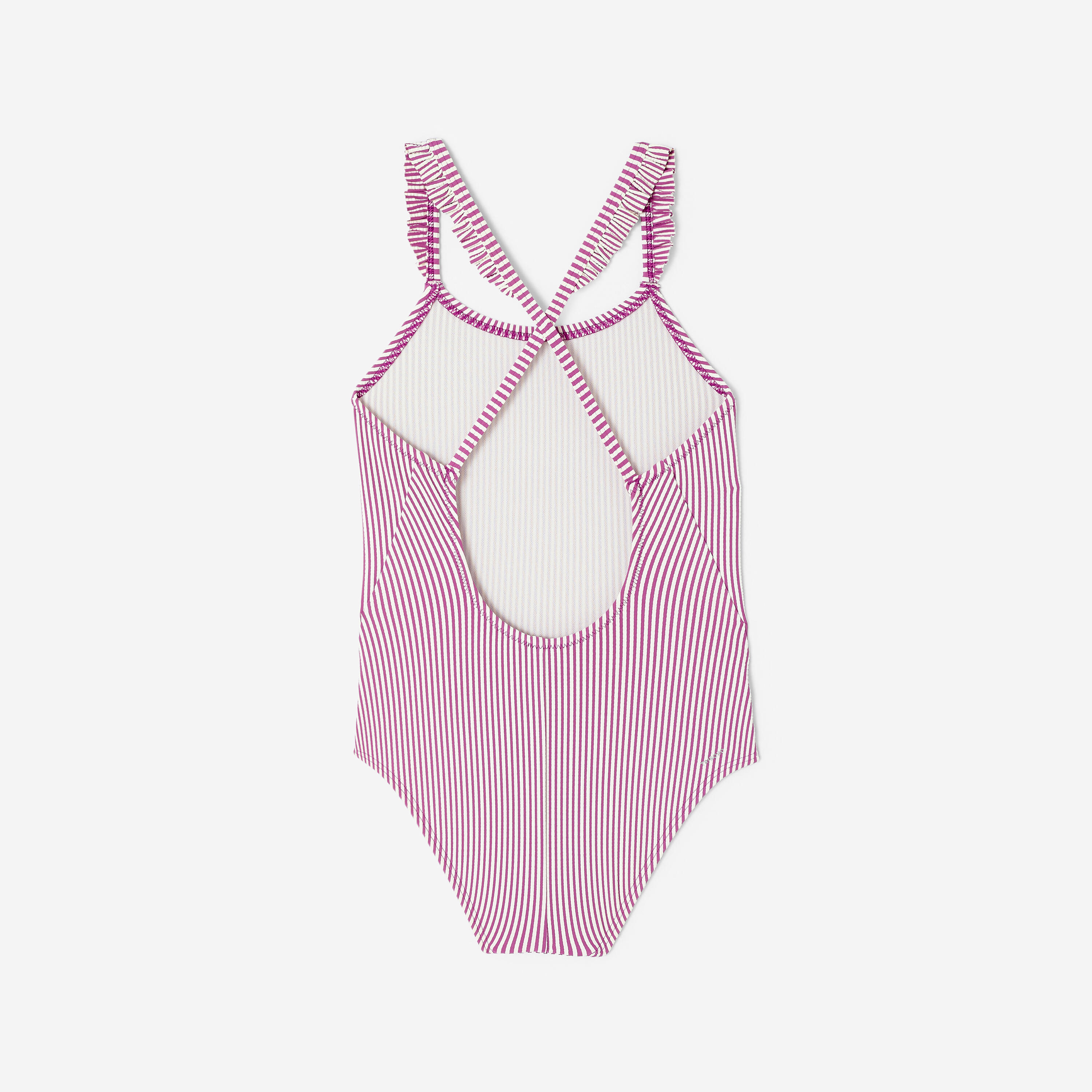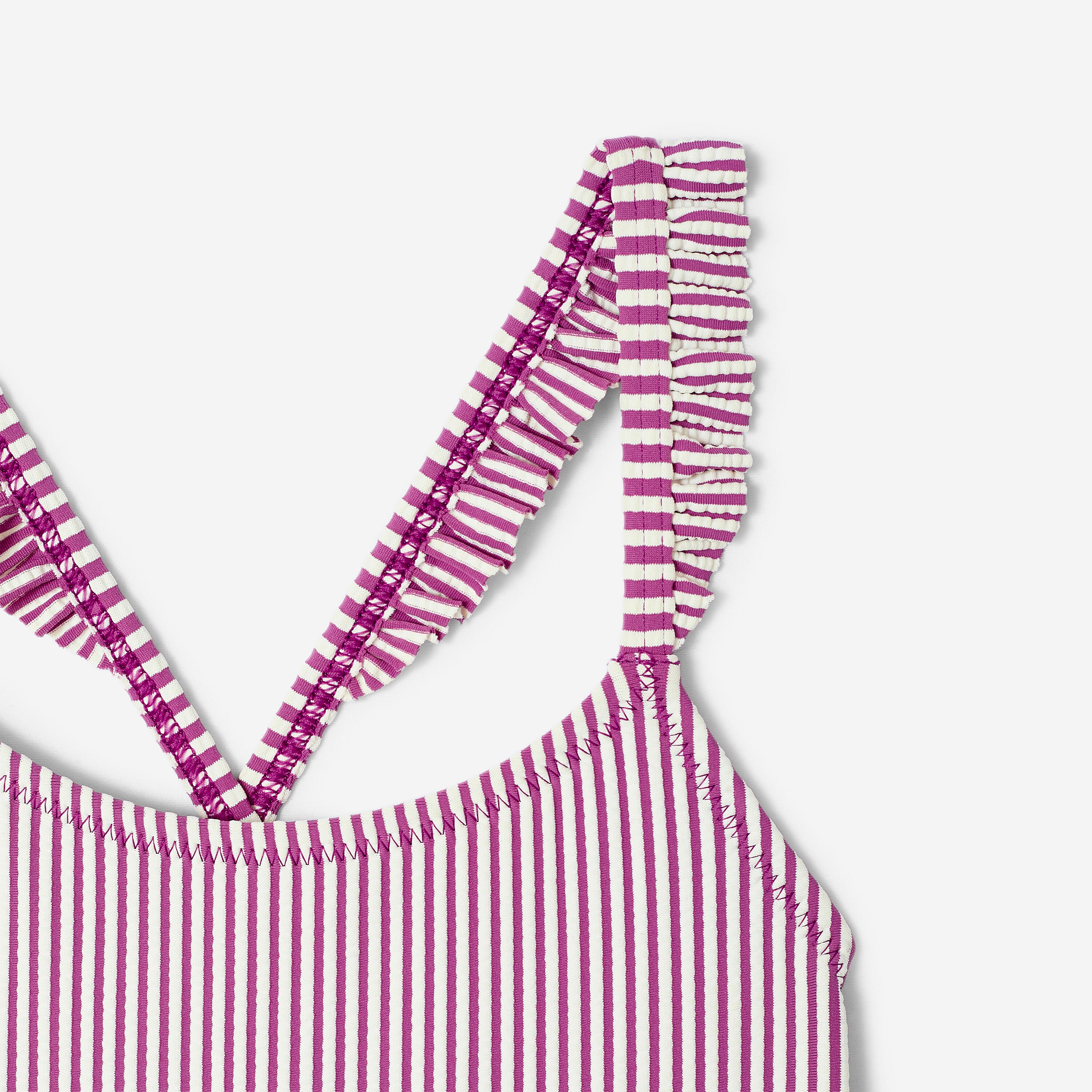 Textured fabric, stripes and ruffles on the straps: to look stylish even in the water. The thin, criss-cross straps and open back offer great freedom of movement.