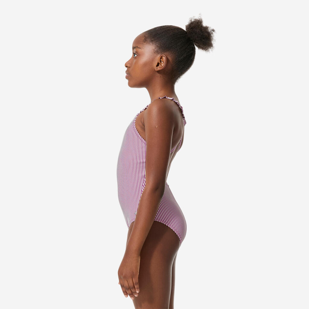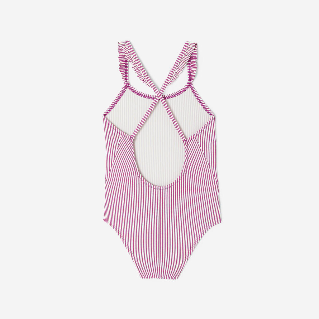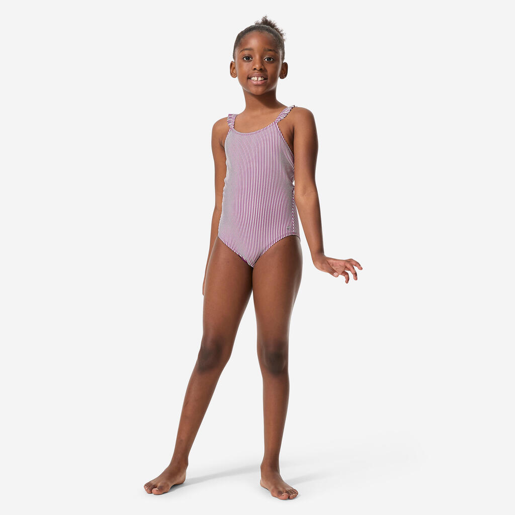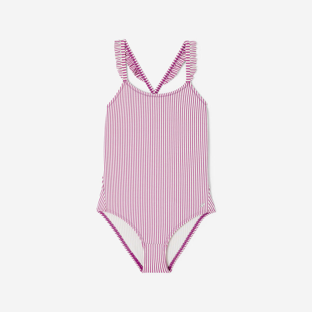 Textured fabric, stripes and ruffles on the straps: to look stylish even in the water. The thin, criss-cross straps and open back offer great freedom of movement.