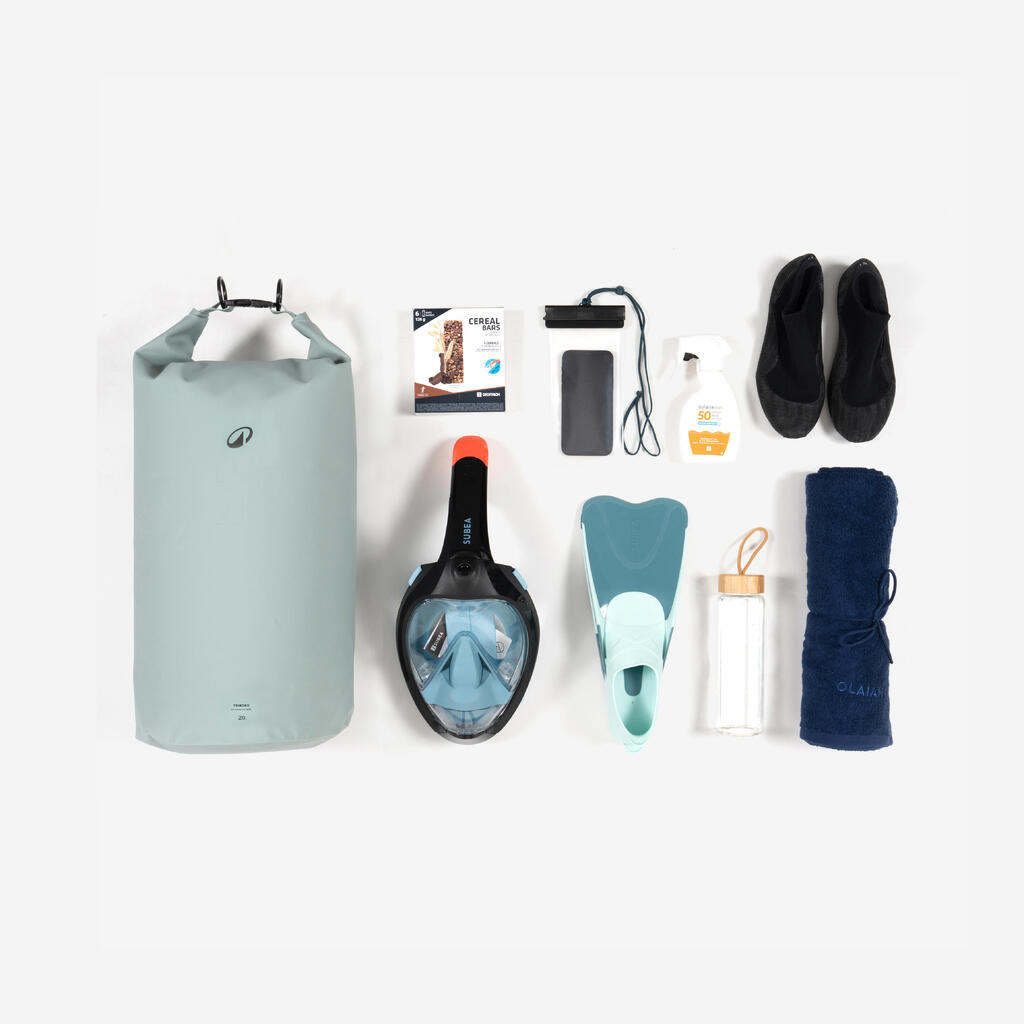 This 20 L dry bag is waterproof against strong water sprays (waves). Quick and easy fastening at two points. Features a strap so it can be carried over your shoulder.
