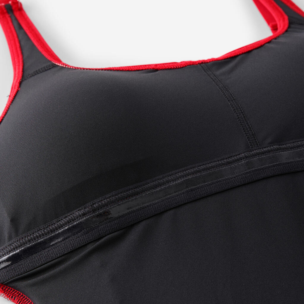 A women’s 1-piece swimsuit with good coverage, designed for aquafitness or swimming with confidence. Feel confident in yourself and in your swimsuit!