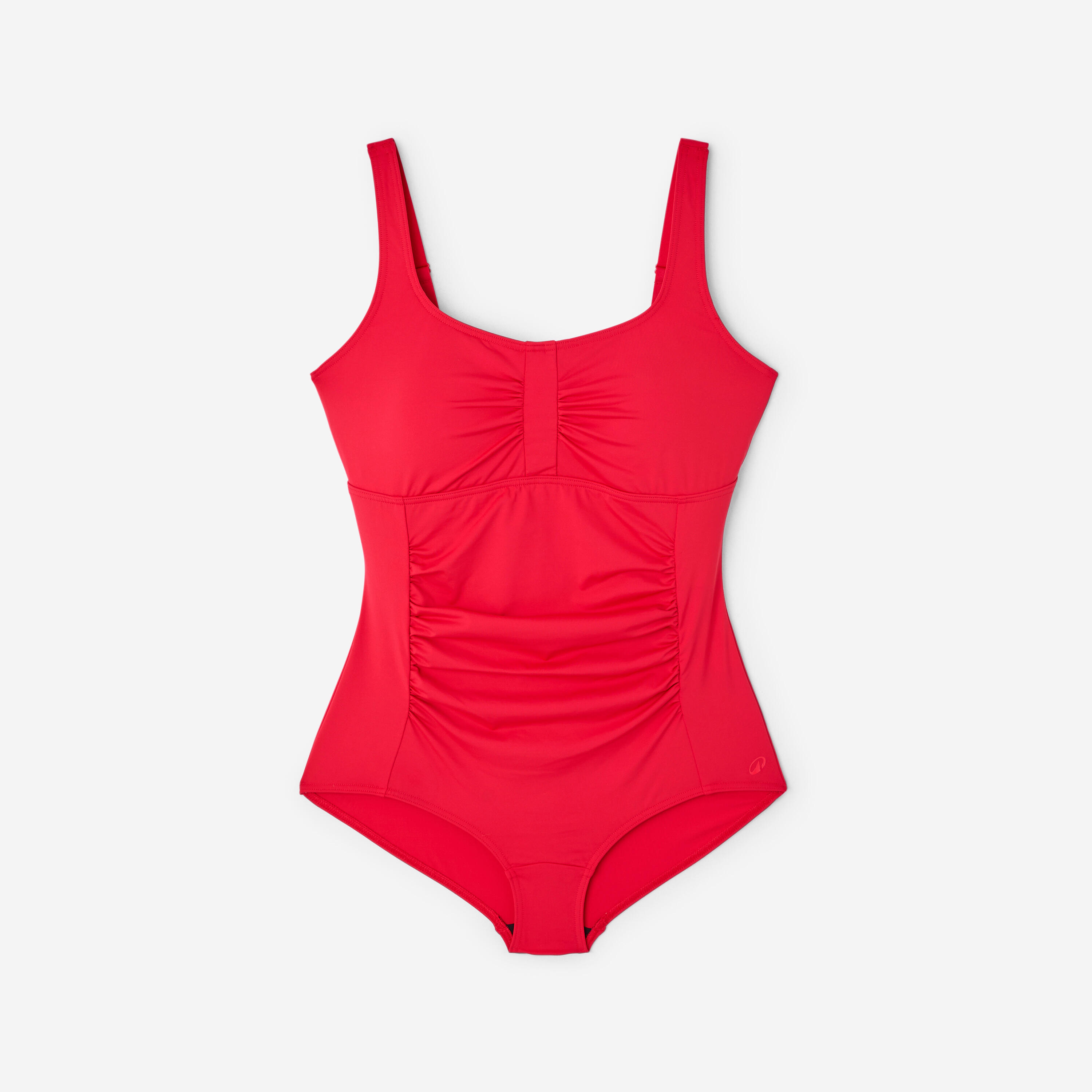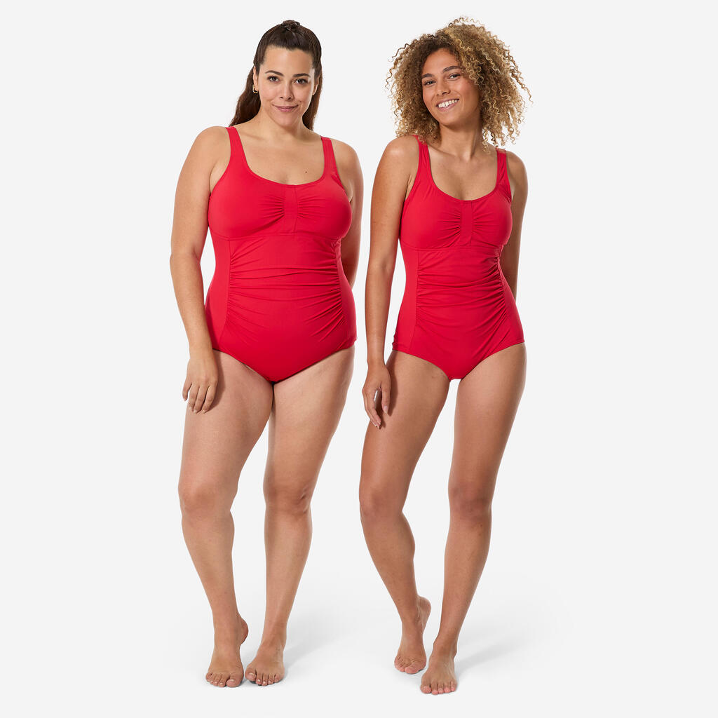 Looking for a 1-piece swimsuit that flatters your curves while covering your hips? This model with removable cups, adjustable straps and gathering around the tummy is available up to size EU 56.