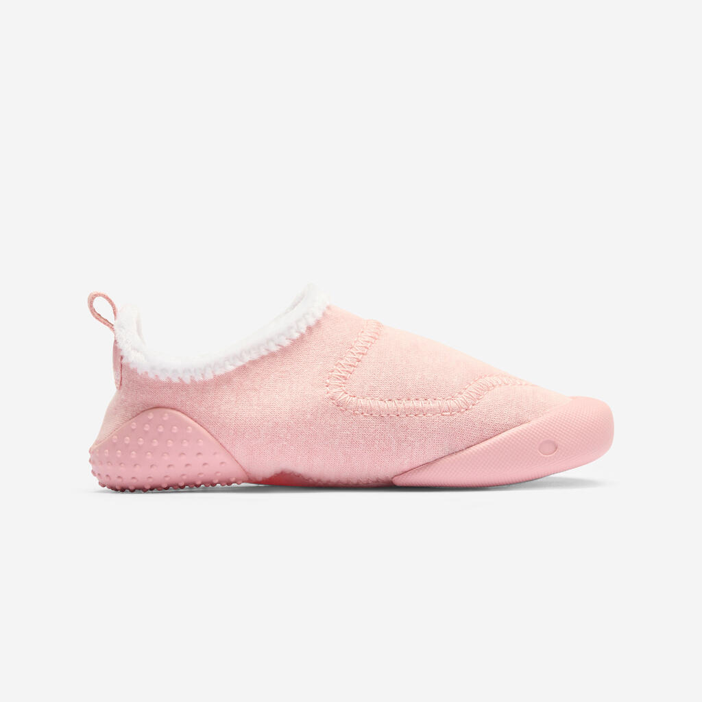 Domyos bootees are for wearing indoors on soft floors. They are meant to be worn without socks for better contact with the ground. The nerves on the bottom of the feet will "feel" the floor to help children find their balance.